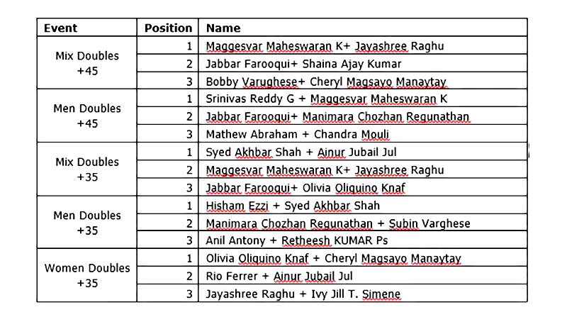From 31 March 2025 to 2 April 2025, participants competed across various categories and age groups, showcasing their skills in both Men’s/Women’s doubles and Mixed doubles matches. The event highlighted not only the players’ abilities but also their lifelong passion for the sport, further promoting badminton as an inclusive activity that transcends age.Badminton players from various countries like India, Indonesia, Philippines, Malaysia, Lebanon, Russia, Pakistan and Kuwait participated in the tournament. Event was hosted in categories as follows. Mix Doubles +35, Women Doubles +35, Men Doubles +35, Men Doubles +45, Mix Doubles +45.